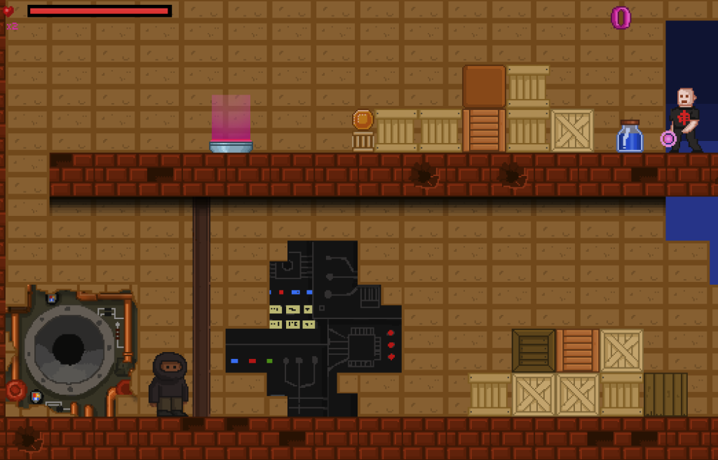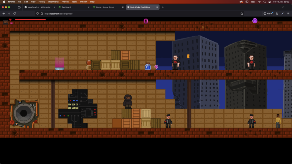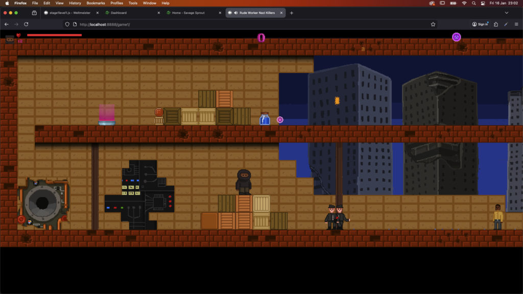 All the graphics are hand drawn and animated using Photoshop. Animations are drawn frame by frame. All recreated from pencil drawings. It takes longer but hopefully my passion for pixel art will give the game a unique and different look. Code is written in JavaScript, currently utilising the HTML Canvas object in modern web browsers. I have extended an existing HTML/JS library called ImpactJS.